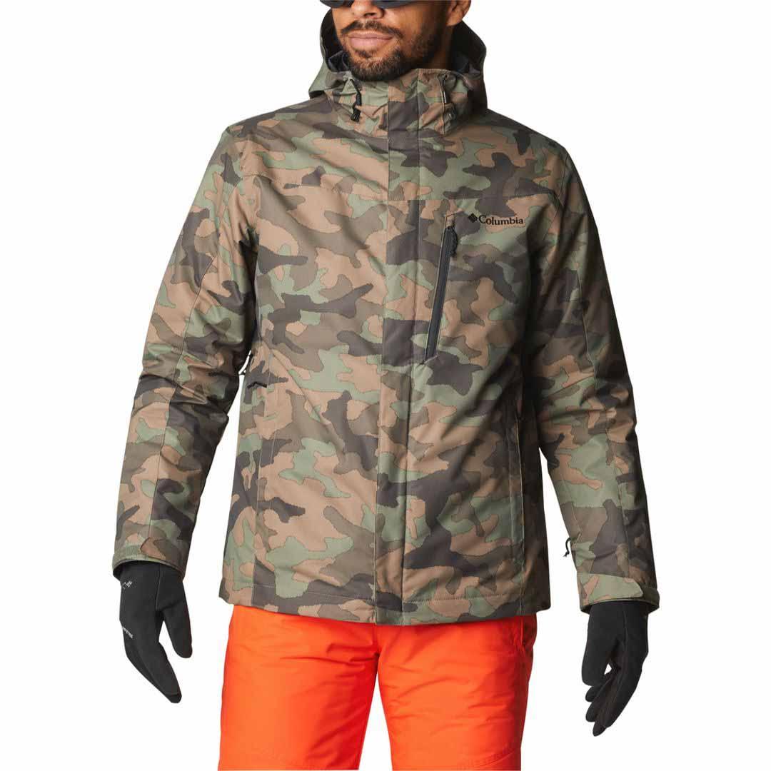 Mountain-ready features include ski pass, goggle, security, chest, and hand pockets, underarm vents and adjustable hood, powder skirt, cuffs, and hem.